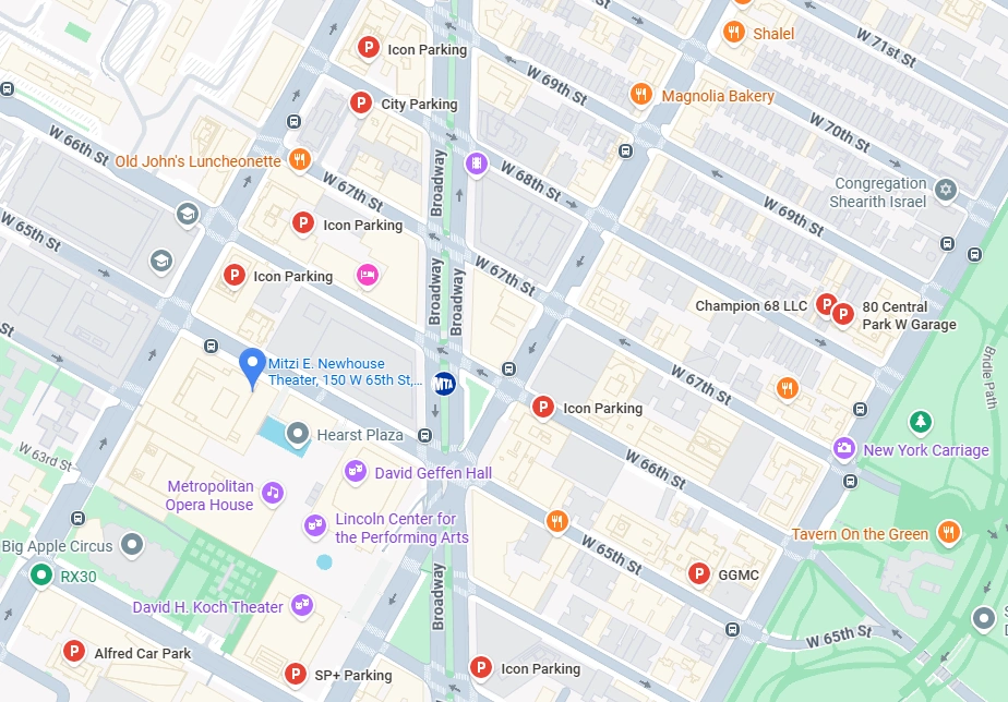 If you are driving to the theater, it is recommended that you arrive no later than 45 minutes before your ticketed event’s opening time, to give you plenty of time to find parking. The Mitzi E. Newhouse Theater recommends arrival by bus or subway to avoid parking frustrations.